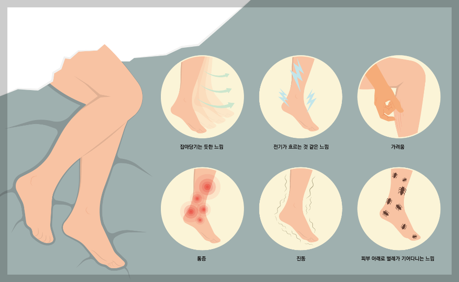 하체에서 느껴지는 불편한 감각으로 다리를 자꾸 움직이게 되며, 그로 인해 수면 장애가 생깁니다.